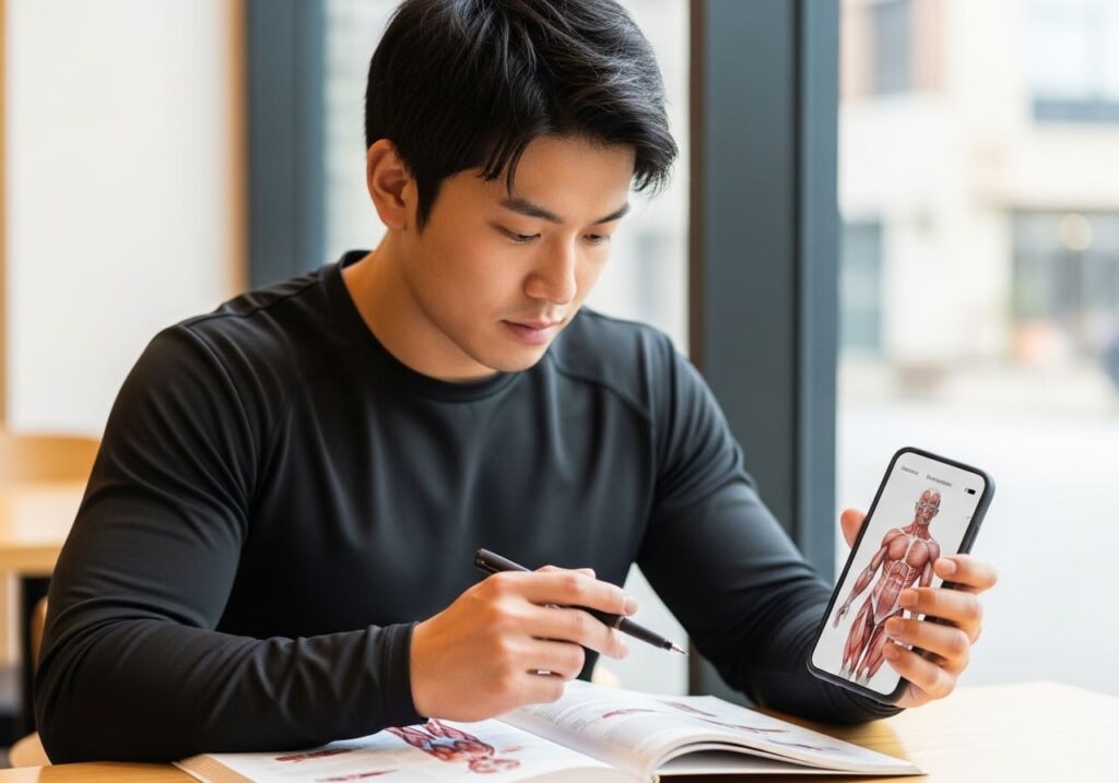 まず解剖学で体の設計図を理解し、その上で機能解剖学の視点を加えるのが理想的です。※1 機能解剖学を学ぶことで、特定のエクササイズがなぜ効果的か、どのフォームが安全かを科学的に説明できるようになります。