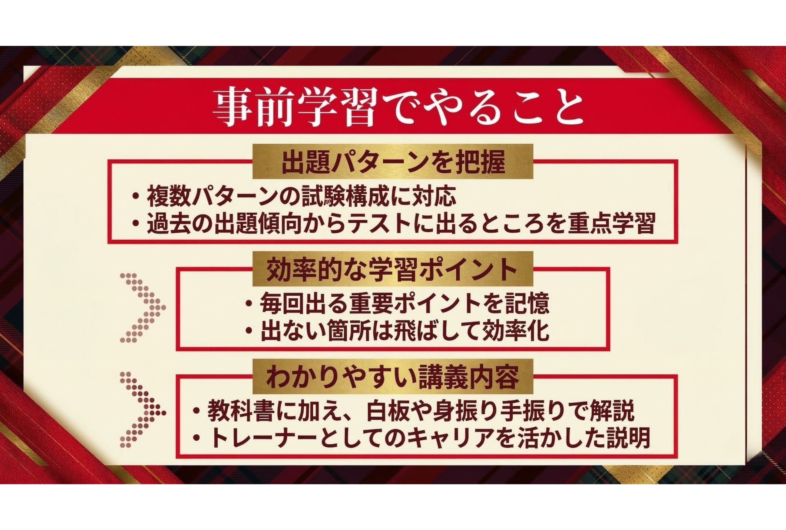 例えば、事前講習で横に座った現役トレーナーの方にお話を聞くと、資格の内容を実際の現場で使用したことはほとんどないと言っておられました。それでは、あまり時間をかけないで合格するにはどうしたらいいか。