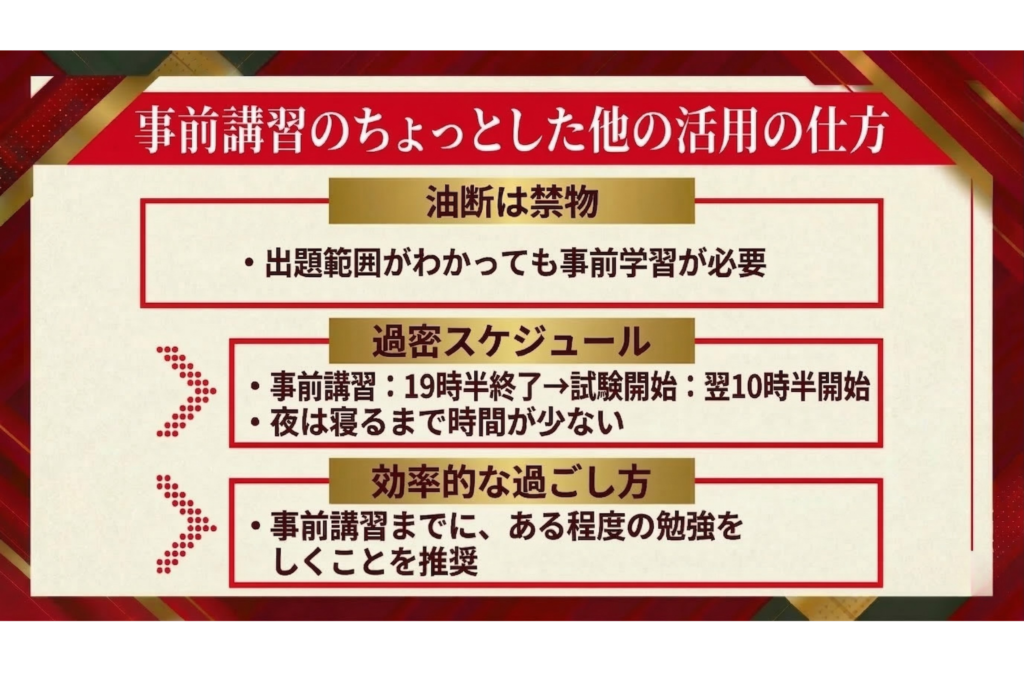 この短時間で出るところを一から暗記しようとすると時間的に無理だと思います。なので、やはり事前講習までにある程度勉強しておく事をおすすめします。