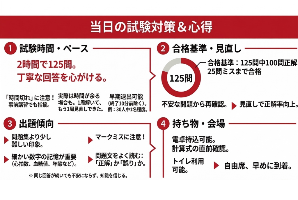 試験は125問中100問以上正解すれば合格です。つまり25問は間違えても合格できるので焦らず余った時間を使って落ち着いて見直してください。見直しの際は、問題用紙に自信のある問題、迷った問題、全く分からなかった問題が分かるようにしておき、まずは迷った問題に時間をかけ、正解率を上げると合格しやすいです。