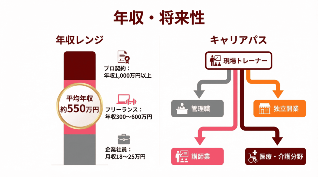 フリーランスやジム経営者の場合、年収にして300万~600万、プロアスリートとの契約なら1,000万円も望めます。