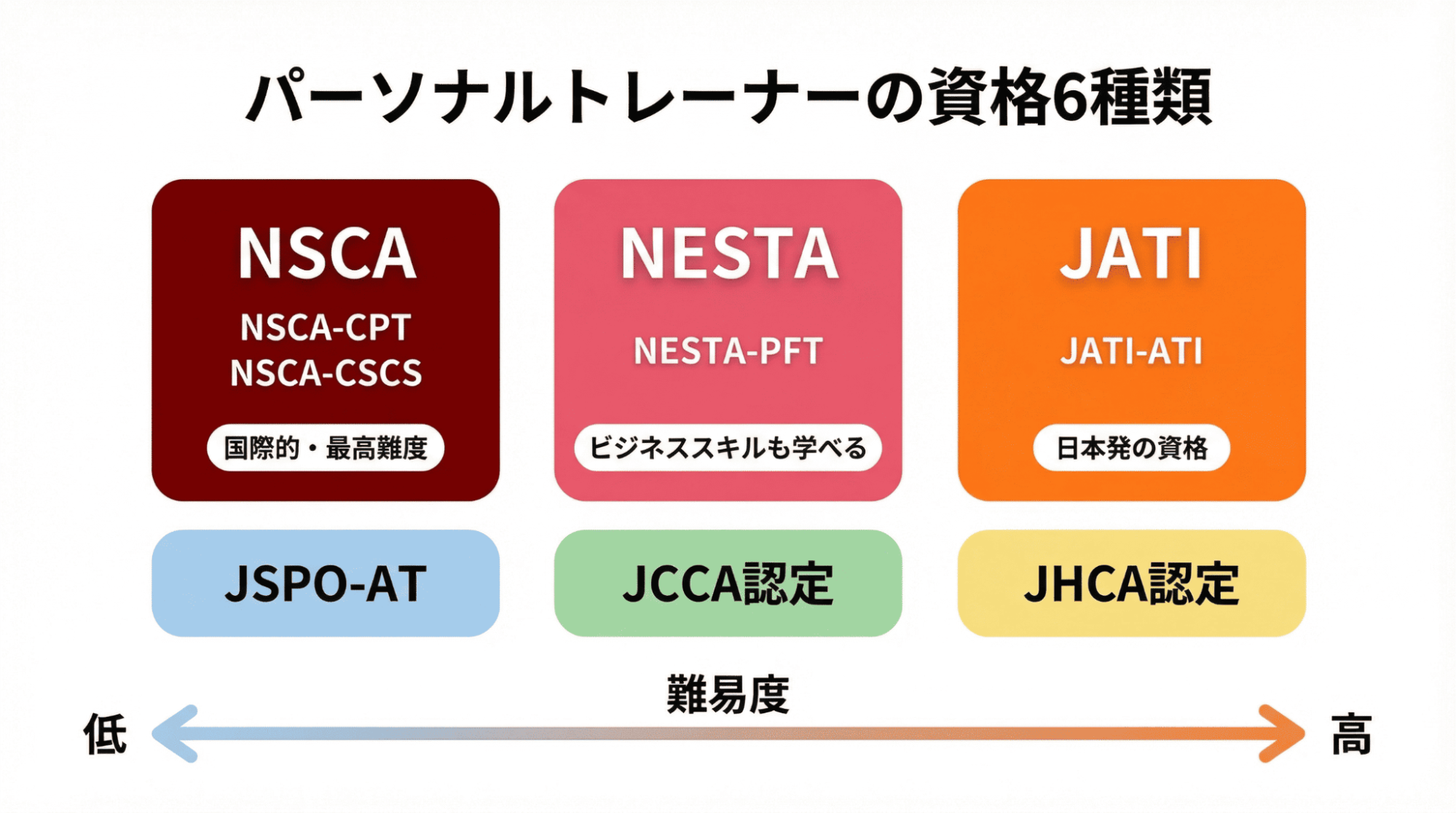 必要な知識が最も多く、勉強量が稼げるのはNSCAです。NESTAやJATIでは、凝縮した形で必要な知識のみを吸収できるので、基礎的な学習に向いています。