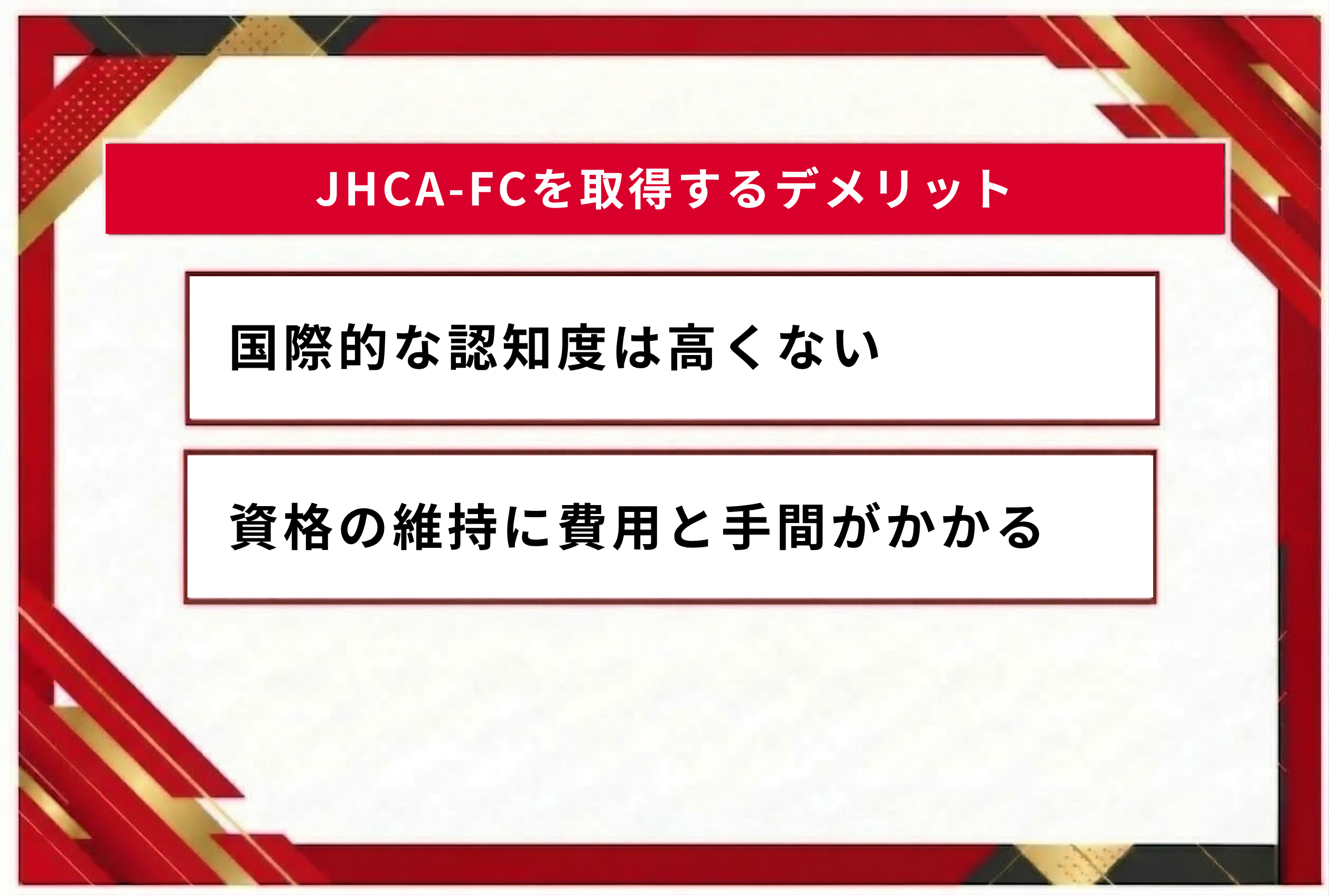 メリットが多い一方で、JHCA-FCにも事前に知っておくべき側面があります。 資格選びで後悔しないために、デメリットもしっかり把握しておきましょう。