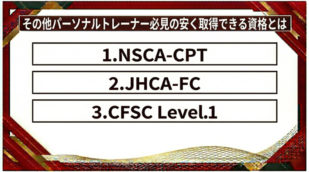 NESTA-PFT以外にも、パーソナルトレーナーとしてのキャリアを築く上で役立つ資格は数多く存在します。ここでは、特に費用を抑えて取得できる、コストパフォーマンスの高い以下の4つの資格を厳選してご紹介します。