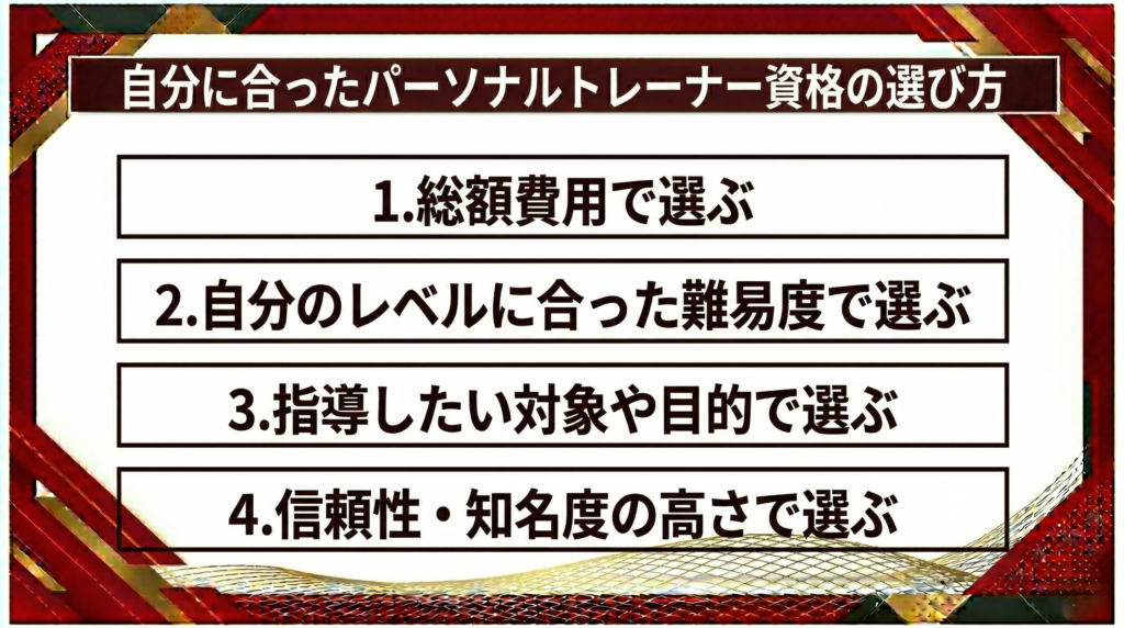 数あるパーソナルトレーナー資格の中から、自分に最適なものを選ぶのは簡単ではありません。しかし、以下の4つのポイントを押さえることで、後悔のない選択ができます。