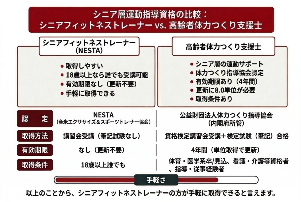 シニア向けの運動指導資格として「高齢者体力つくり支援士」があります。