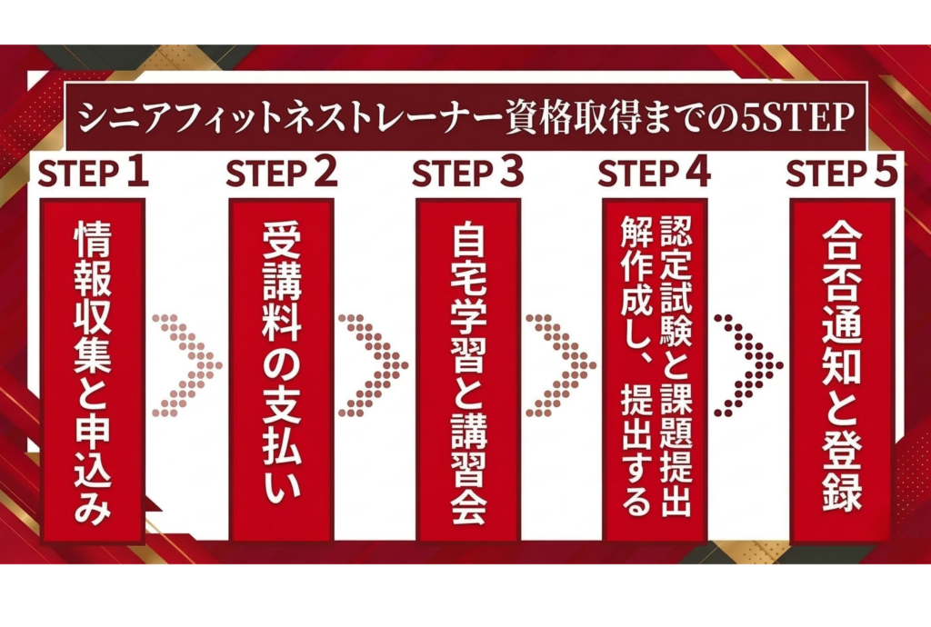 シニアフィットネストレーナーの資格取得は、以下の5つのステップで進みます。